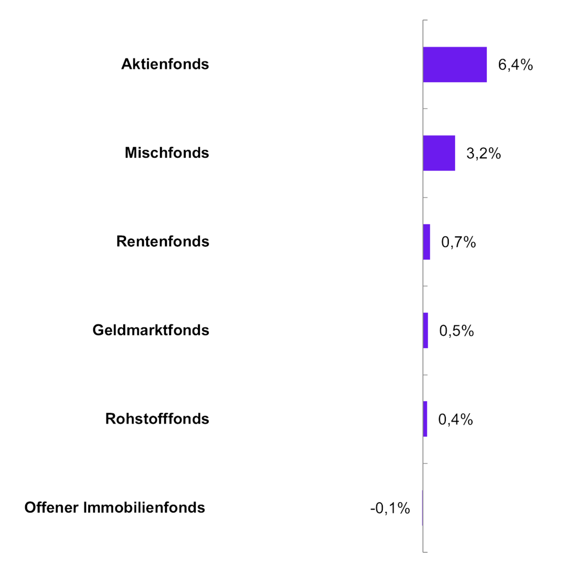 Im Mai brachten die jüngste Annäherung zwischen China und den USA sowie der erst kürzlich bekanntgegebene Aufschub weiterer Zoll-Maßnahmen Erleichterung bei Anlegerinnen und Anlegern – und sorgten für gute Stimmung an den Märkten. So schlossen Aktienfonds (6,4 %), Mischfonds (3,2 %), Rentenfonds (0,7 %), Geldmarktfonds (0,5 %) und Rohstofffonds (0,4 %) mit einer positiven Performance ab. Lediglich offene Immobilienfonds (-0,1 %) beendeten den Handelsmonat Mai mit einer negativen Performance.