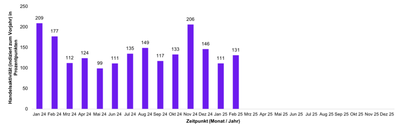 Die Handelsaktivität basiert auf dem Handelsvolumen und lässt unmittelbare Rückschlüsse auf den aktuellen Jahrestrend im Handel mit ETFs bei Kunden der FNZ Bank zu. Ein Wert von über 100 steht für eine überdurchschnittliche Handelsaktivität der Kunden im Vergleich zum mittleren monatlichen Handelsvolumen des Vorjahres; ein Stand unter 100 zeigt eine unterdurchschnittliche Handelsaktivität an.