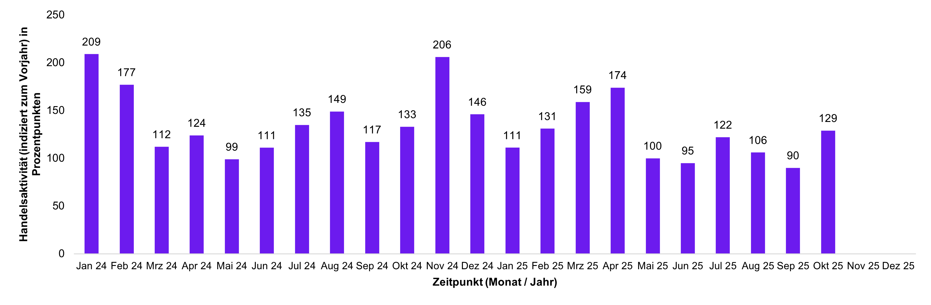 Die Handelsaktivität basiert auf dem Handelsvolumen und lässt unmittelbare Rückschlüsse auf den aktuellen Jahrestrend im Handel mit ETFs bei Kunden der FNZ Bank zu. Ein Wert von über 100 steht für eine überdurchschnittliche Handelsaktivität der Kunden im Vergleich zum mittleren monatlichen Handelsvolumen des Vorjahres; ein Stand unter 100 zeigt eine unterdurchschnittliche Handelsaktivität an.